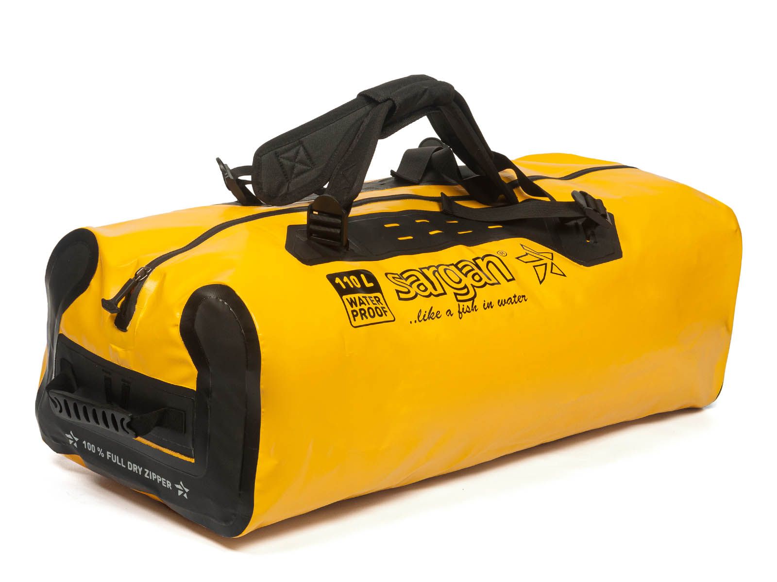 Гермосумка-рюкзак SARGAN «ПРОГРЕССОР 110.0» с абсолютно герметичной молнией, двуцветная - изготовлена из прочного, не пропускающего воду материала – литого морозостойкого ПВХ с температурными пределами: минус 50 - плюс 70 градусов Цельсия, плотность 630 гр/м2 +-30гр.. Фурнитура – Полиацеталь, удароморозостойкая.