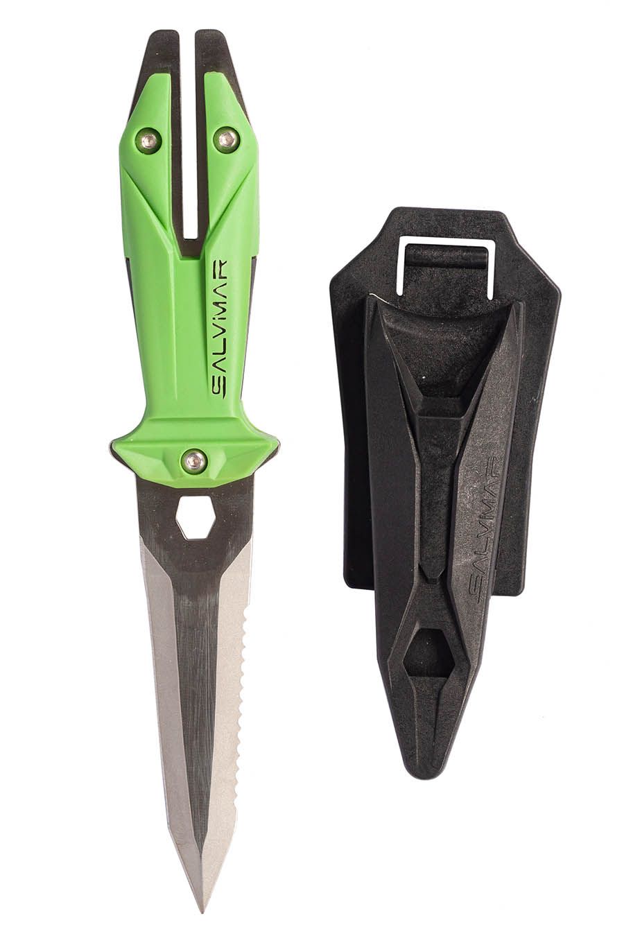 - Нож Salvimar GOEMON оснащен специальным отверстием для выправления гарпуна. То есть если у Вас погнулся гарпун – можно вставить его в это отверстие и использовать нож как ручку, чтобы выправить гарпун.
