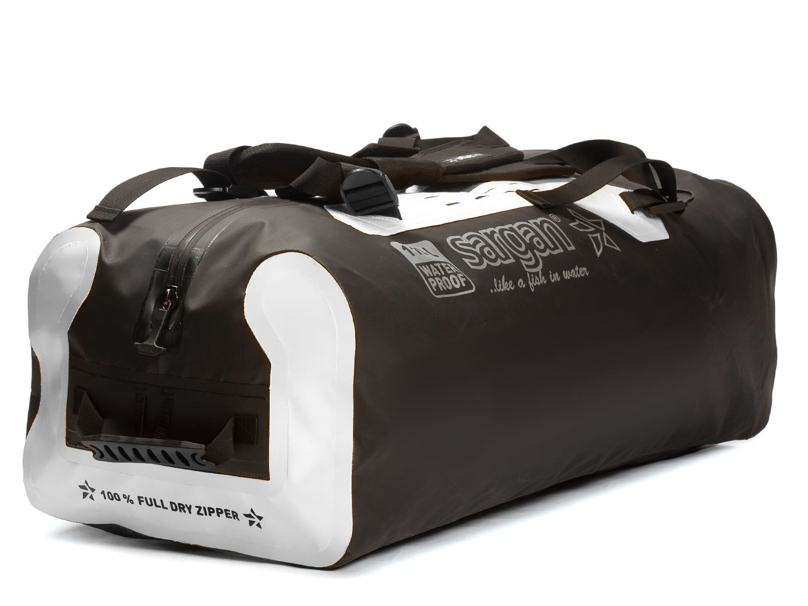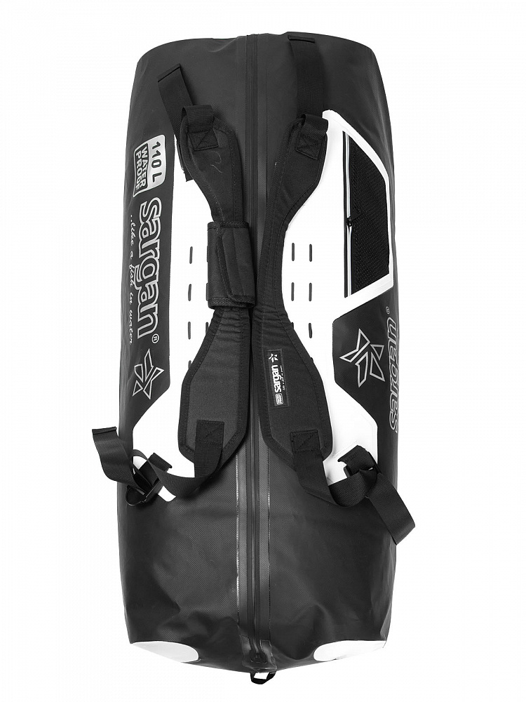 Гермосумка-рюкзак SARGAN «ПРОГРЕССОР 110.0» с абсолютно герметичной молнией, двуцветная - изготовлена из прочного, не пропускающего воду материала – литого морозостойкого ПВХ с температурными пределами: минус 50 - плюс 70 градусов Цельсия, плотность 630 гр/м2 +-30гр.. Фурнитура – Полиацеталь, удароморозостойкая.